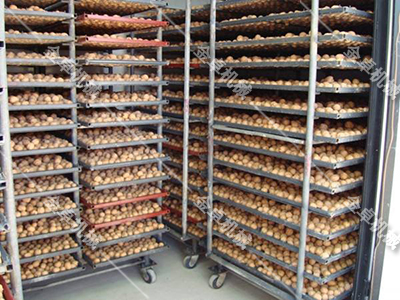 一階段:核桃剛?cè)霠t時,由于含水量還較高,首先用核桃烘干箱逐步升溫,維持20-24小時,使水分逐步蒸發(fā),濕度調(diào)節(jié)自動排濕,持續(xù)2-3天,使大部分水分排出。