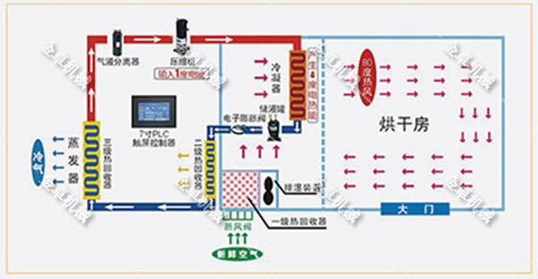 菊花烘干房是利用逆卡諾原理,制冷劑(大部分為混合制冷劑)被壓縮機(jī)壓縮,變成高溫高壓的氣體,通過管路(銅管)進(jìn)入換熱器(冷凝器)中,然后再通過風(fēng)機(jī),將換熱器(冷凝器)產(chǎn)生的熱量送至烘干房內(nèi)對菊花等物料進(jìn)行加熱、烘干,從而使菊花得到干燥,濕氣由排濕口排出,